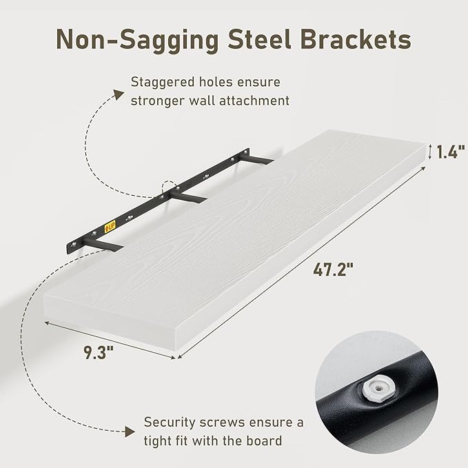 - 48 Inch Floating Shelves for Wall (Set of 2): Each wall shelves are 9.3 inches in depth and 1.4 inches in thickness. 2-piece set is more cost-effective and practical. Our wall shelf can be used in combination, staggered high or low on the wall, or mounted side-by-side to provide extra storage space for organizing small items and clutter in multiple areas such as kitchens, bathrooms, and bedrooms, creating a clean and smooth look. Multiple colors available