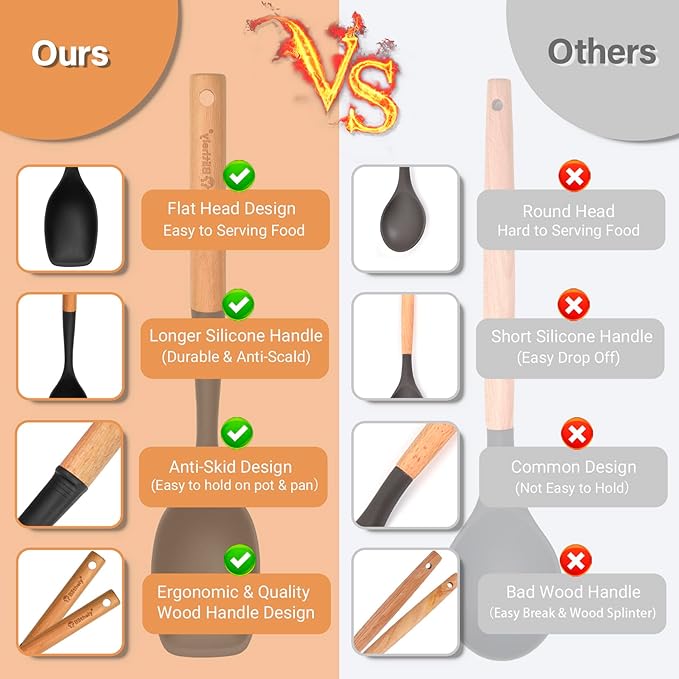- š„ćComfortable & Ergonomic Wooden HandlećThis Silicone Cooking Spoons are designed with natural wood handle. The smooth round handle can reduce hand fatigue during prolonged cooking sessions.The natural wood provides a secure grip, resists heat transfer, and complements modern kitchen aesthetics, and fits comfortably in your palm, offering precision for delicate tasks like flipping eggs or portioning pasta.