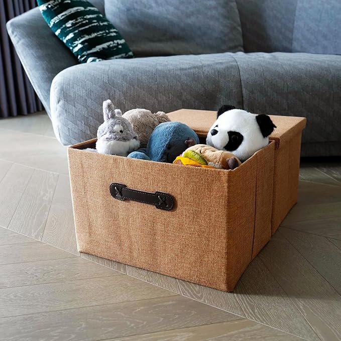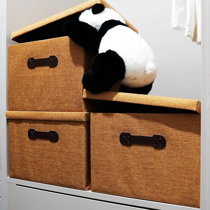 Enzk&Unity Decorative Storage Bins with Lids, Fabric Linen Foldable Storage Box with Handle Home Organizer for Shelf, Closet, Bedroom, Living Room, Office, 3 Packs, Brown