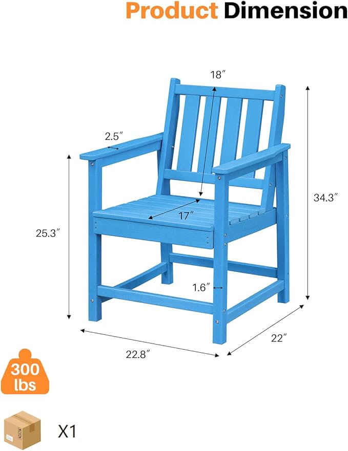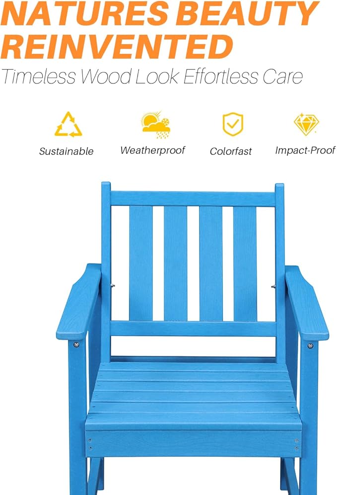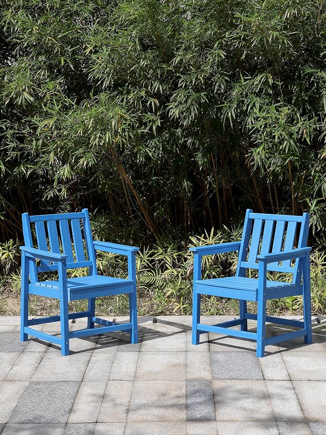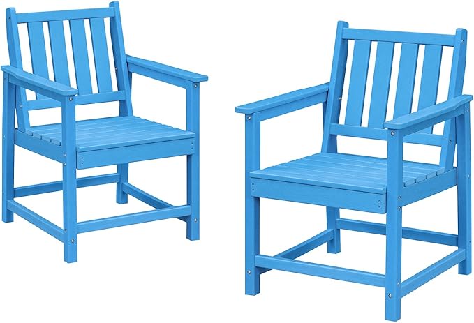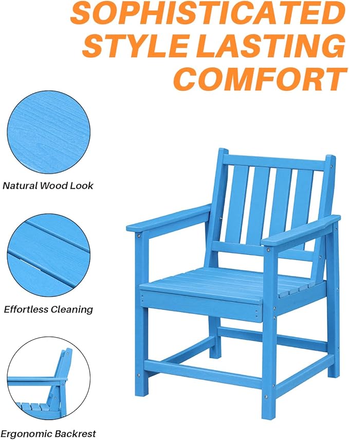 - Durable Eco-Friendly HDPE Construction: Crafted from 100% recyclable, military-grade high-density polyethylene, this 2-pack patio chair set offers long-lasting durability and a realistic wood grain finish. Resistant to fading and UV damage, these eco-friendly chairs bring natural wood look and feel without the maintenance—perfect for all your outdoor settings from patios to pool decks. The sky blue option adds a refreshing touch that blends beautifully with oceanfront patios, garden greenery, or modern outdoor aesthetics.
