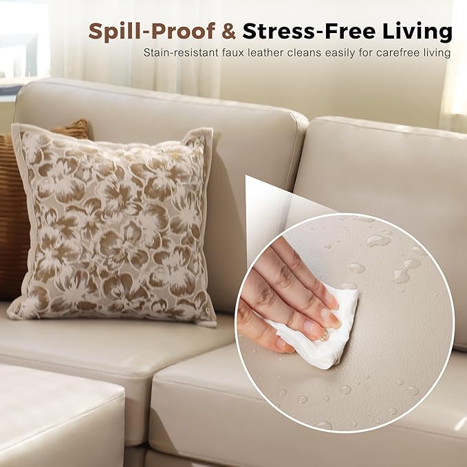 - đź’ˇEffortless-Clean Faux Leather Sofa: Waterproof and stain-resistant faux leather stays spotless. Wipe spills clean in 10 seconds with a damp cloth. The scratch-resistant textured surface feels soft and smooth, maintaining a stylish look even with pets and kids.