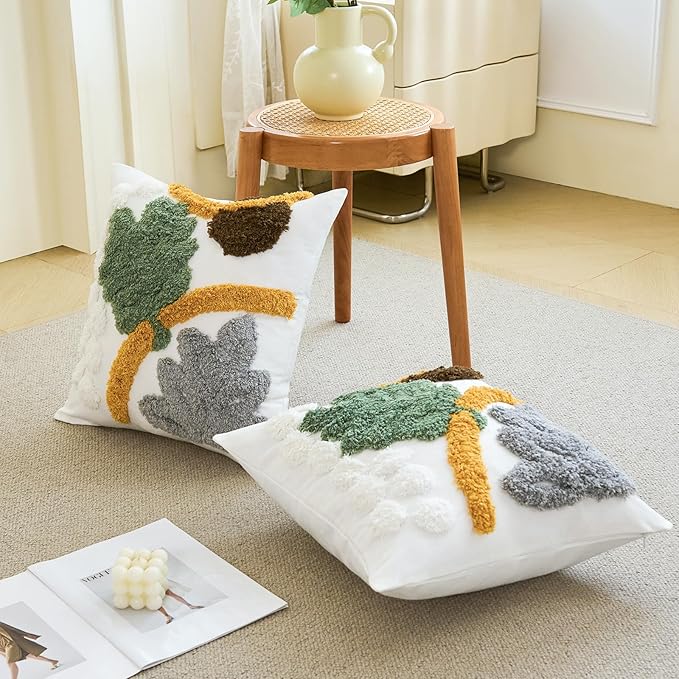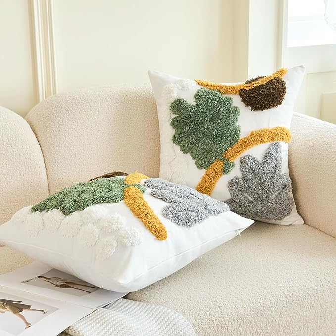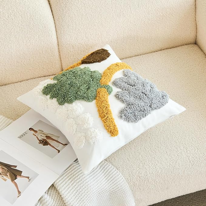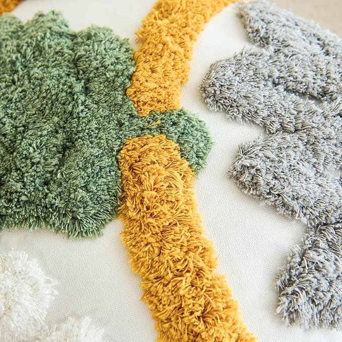 - ⭐【FABRIC AND SIZE】The front of this boho couch pillow cover is made of 100% polyester + 10% viscose,the backside is made of 100% cotton.Measures 18x18 inches.Exquisite workmanship enables tufting part dense soft and aesthetic.The 3D effect with the tufting technic makes these abstract pillow covers so distinctive