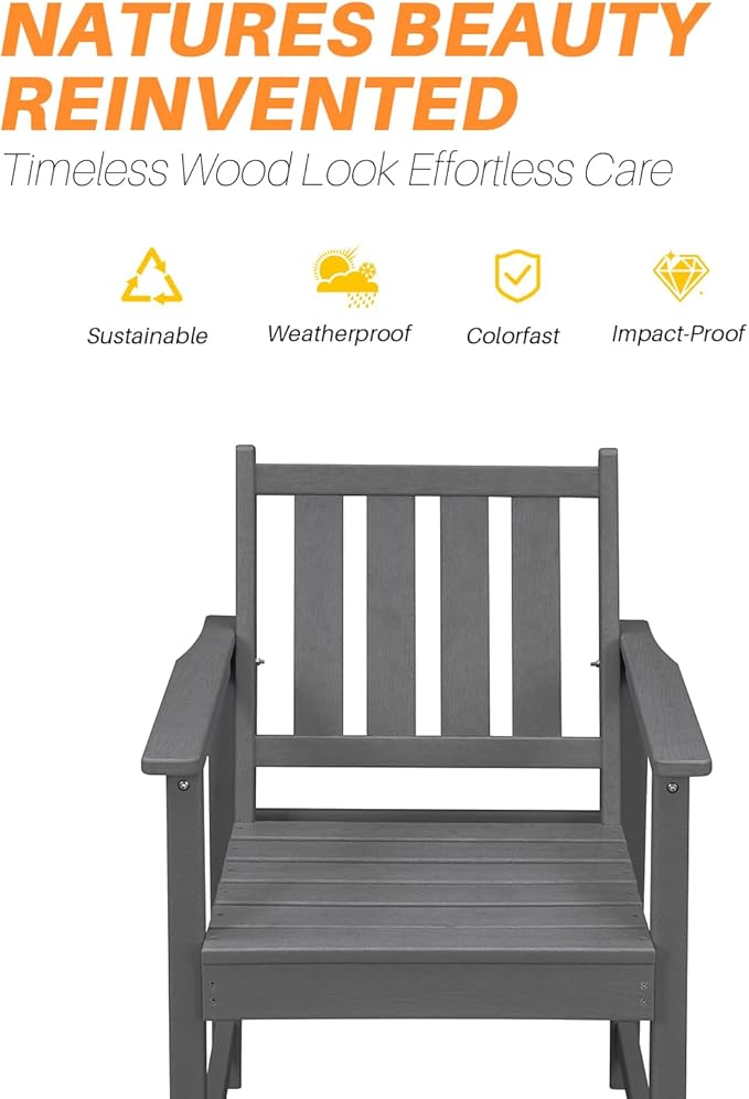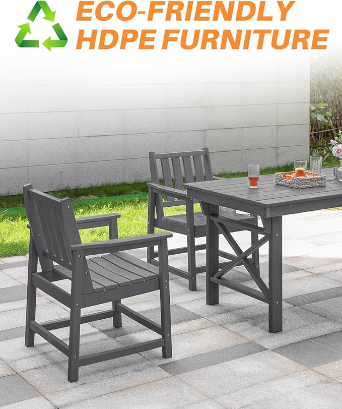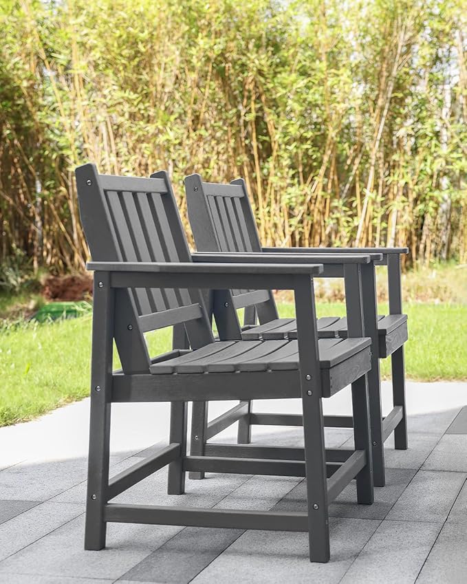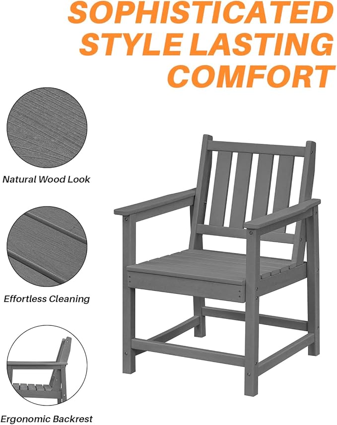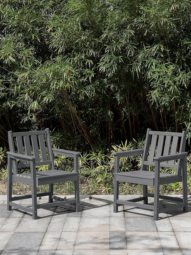 - Eco-Friendly Strength & Style: Crafted from 100% recyclable, military-grade high-density polyethylene, this 2-pack patio chair set combines long-lasting durability with a realistic wood grain finish. Resistant to fading and UV damage, these eco-conscious chairs deliver the natural look of wood without upkeep. The subtle smoke gray finish adds a modern, versatile accent that complements any outdoor décor, blending sustainability and contemporary design in one reliable package.