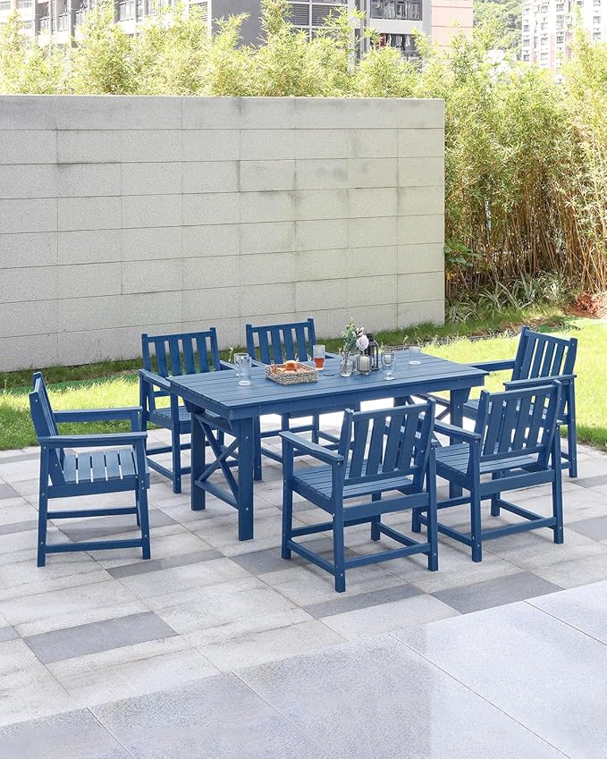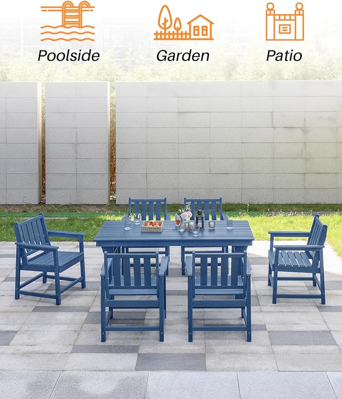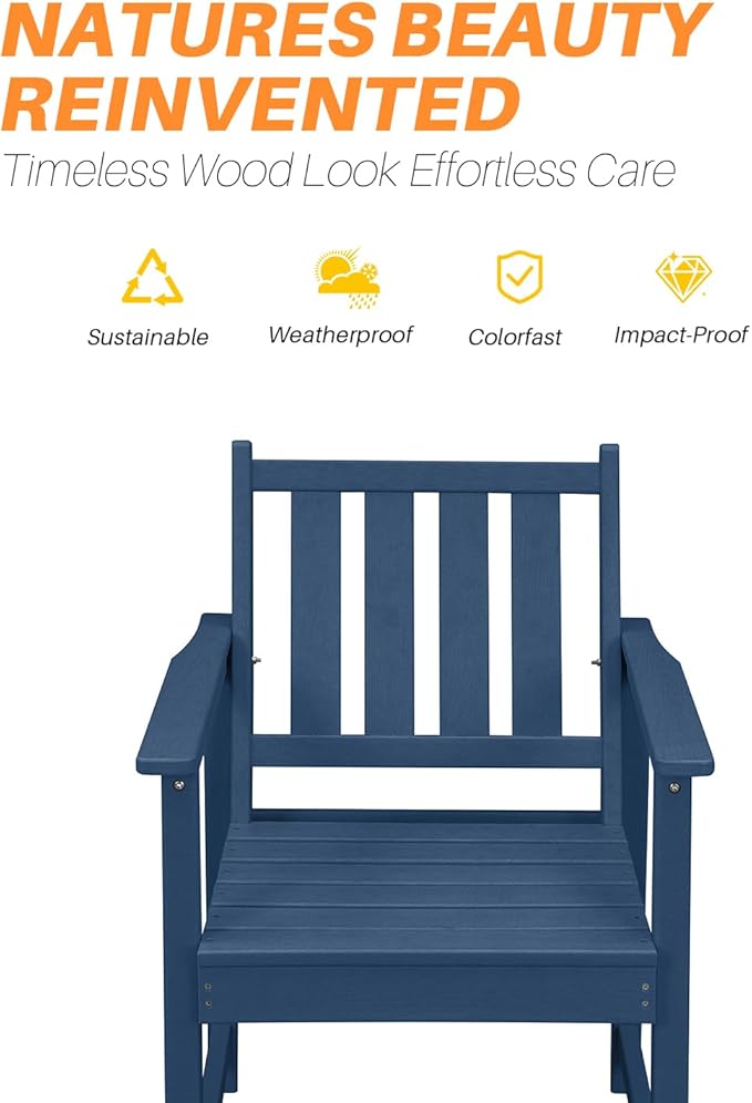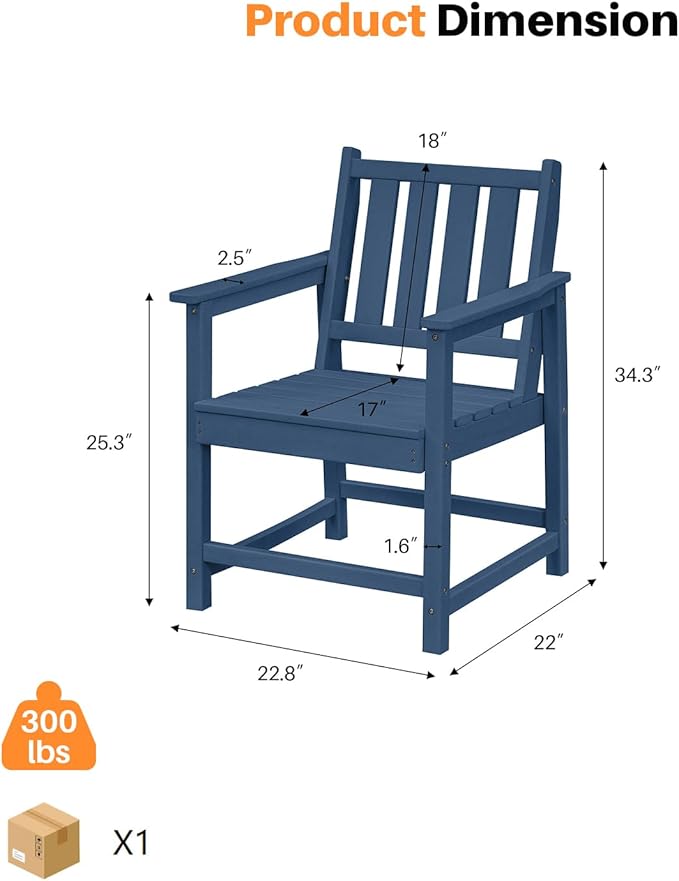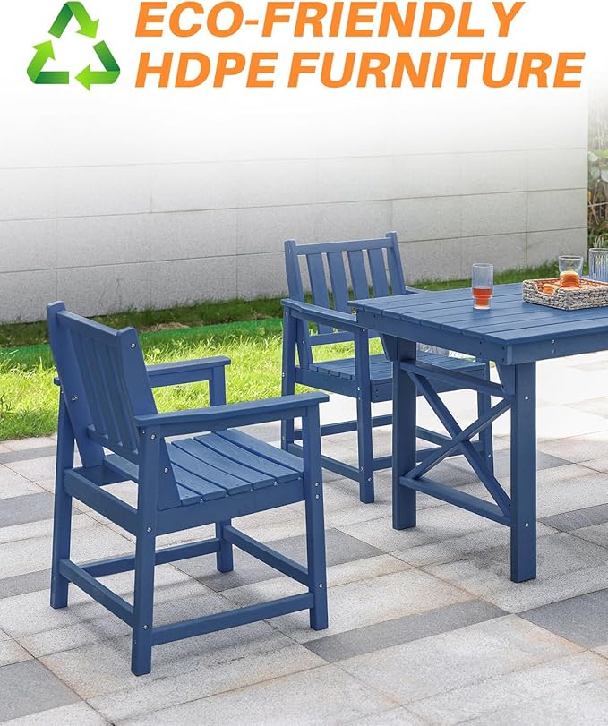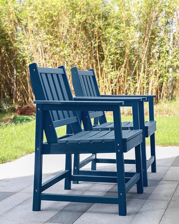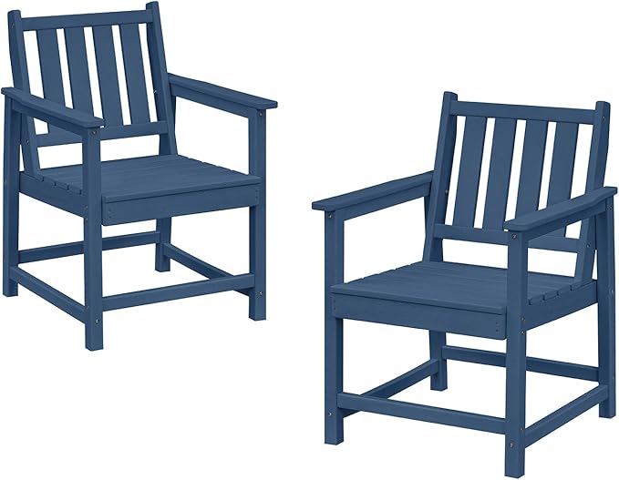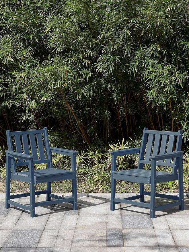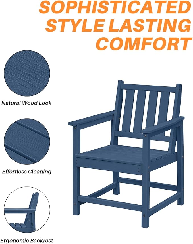- Durable Eco-Friendly HDPE: Crafted from 100% recyclable, military-grade high-density polyethylene, this 2-pack patio chair set offers long-lasting durability and a realistic wood grain finish. Resistant to fading and UV damage, these eco-friendly chairs bring natural wood look and feel without the maintenance—perfect for all your outdoor settings from patios to pool decks. The deep navy blue finish adds a classic, calming touch that enhances your outdoor space with subtle elegance, combining strength, sustainability, and timeless style in one reliable design.