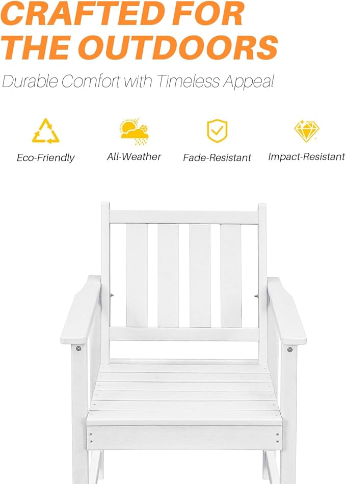 - Eco-Friendly Wood Grain HDPE Material: Made from 100% recyclable HDPE with a 3D embossed wood grain surface, this set mimics the look and texture of real wood while offering superior resistance to fading, cracking, and warping. With a baby-safe surface, food-grade quality, and easy-to-clean design, it outperforms standard plastic outdoor furniture. pearl White finish enhances outdoor spaces while standing up to intense sun, rain, or snow, retaining a like-new look for many years.