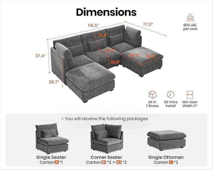 - 【Shipped in Seven Packages for Easy Setup】To enhance your convenience, the sectional will be delivered in seven packages, allowing for easier handling and assembly. Each package is carefully packed to ensure safety during transit, and while they may arrive at different days, rest assured that our professional customer service is ready to assist you with any concern. The thoughtful design makes the setup process simpler and more efficient,ensuring you enjoy your sectional without any hassle