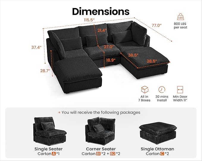 - 【Shipped in Seven Packages for Easy Setup】To enhance your convenience, the sectional will be delivered in seven packages, allowing for easier handling and assembly. Each package is carefully packed to ensure safety during transit, and while they may arrive at different days, rest assured that our professional customer service is ready to assist you with any concern. The thoughtful design makes the setup process simpler and more efficient,ensuring you enjoy your sectional without any hassle