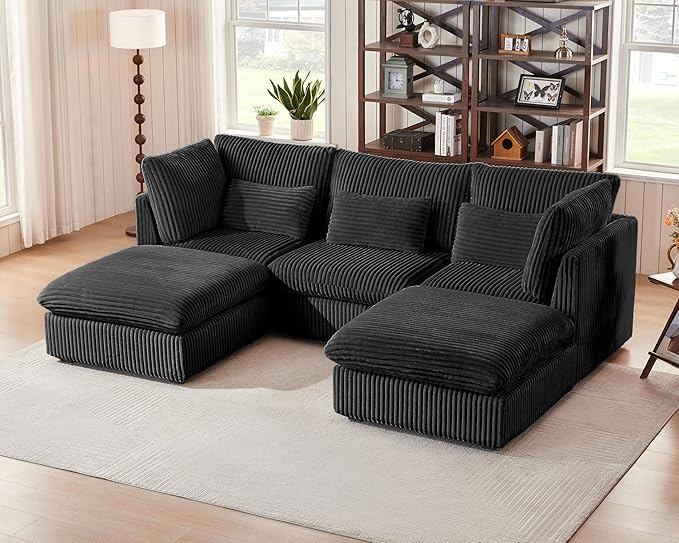 Oversized Modular Sofa, Extra Deep Cloud Corduroy Sectional Couch with Ottoman Chaise, Fluffy Corduroy 5 Seater Sofa Bed for Living Room, Villa (U Shape 5 Seater, Corduroy Black)