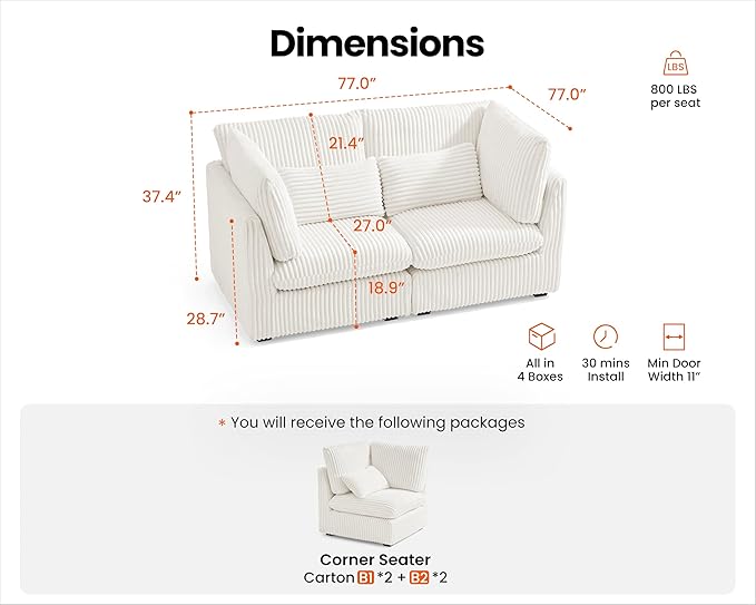 - 【Shipped in Four Packages for Easy Setup】To enhance your convenience, the sectional will be delivered in four packages, allowing for easier handling and assembly. Each package is carefully packed to ensure safety during transit, and while they may arrive at different days, rest assured that our professional customer service is ready to assist you with any concern. The thoughtful design makes the setup process simpler and more efficient,ensuring you enjoy your sectional without any hassle