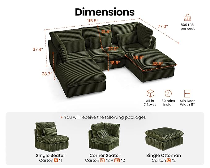 - 【Shipped in Seven Packages for Easy Setup】To enhance your convenience, the sectional will be delivered in seven packages, allowing for easier handling and assembly. Each package is carefully packed to ensure safety during transit, and while they may arrive at different days, rest assured that our professional customer service is ready to assist you with any concern. The thoughtful design makes the setup process simpler and more efficient,ensuring you enjoy your sectional without any hassle