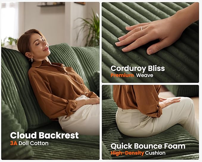 - 【Oversized Extra-Wide Deep Seating with Cloud-Like Comfy】Sink into expansive comfort with 27" deep seat—16.75~ 20% deeper than most sofas—and 38.5" wide seat—10~29.7% wider than typical couches. Stretch out freely with plenty of room to unwind. Featuring high-density foam, soft, skin-friendly corduroy and tightly woven chenille fabric. Relish in the perfect balance of plush softness and firm support. Whether focusing or relaxing, this sofa turns every moment into pure comfort