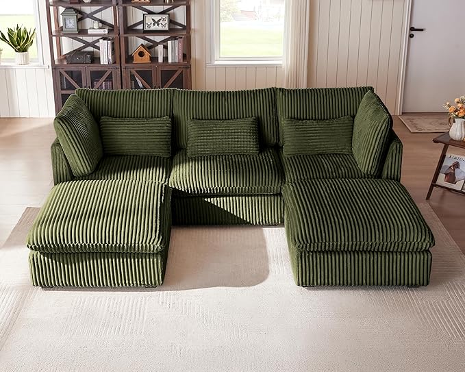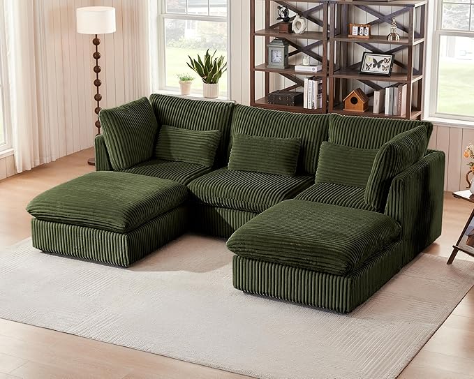Oversized Modular Sofa, Extra Deep Cloud Corduroy Sectional Couch with Ottoman Chaise, Fluffy Corduroy 5 Seater Sofa Bed for Living Room, Villa (U Shape 5 Seater, Corduroy Green)
