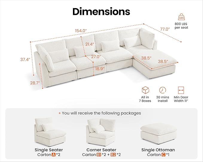 - 【Shipped in Seven Packages for Easy Setup】To enhance your convenience, the sectional will be delivered in seven packages, allowing for easier handling and assembly. Each package is carefully packed to ensure safety during transit, and while they may arrive at different days, rest assured that our professional customer service is ready to assist you with any concern. The thoughtful design makes the setup process simpler and more efficient,ensuring you enjoy your sectional without any hassle