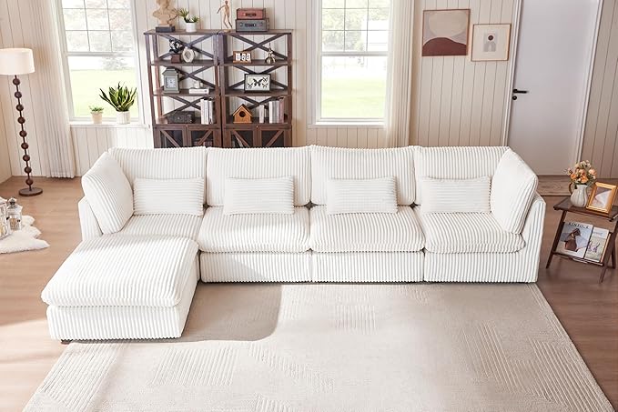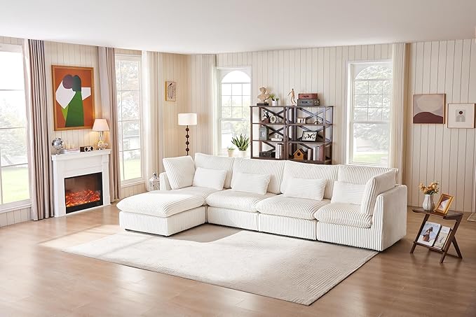 Oversized Modular Sofa, Extra Deep Cloud Corduroy Sectional Couch with Ottoman Chaise, Fluffy Corduroy 5 Seater Sofa Bed for Living Room, Villa (L Shape 5 Seater, Corduroy White)