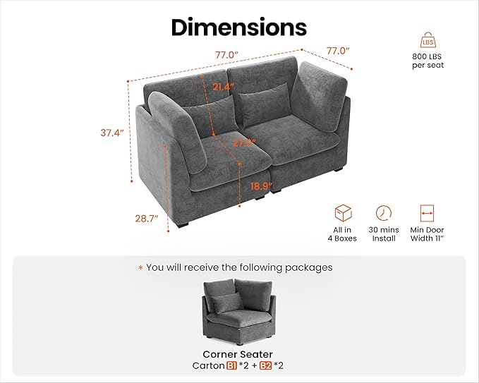 - 【Shipped in Four Packages for Easy Setup】To enhance your convenience, the sectional will be delivered in four packages, allowing for easier handling and assembly. Each package is carefully packed to ensure safety during transit, and while they may arrive at different days, rest assured that our professional customer service is ready to assist you with any concern. The thoughtful design makes the setup process simpler and more efficient,ensuring you enjoy your sectional without any hassle