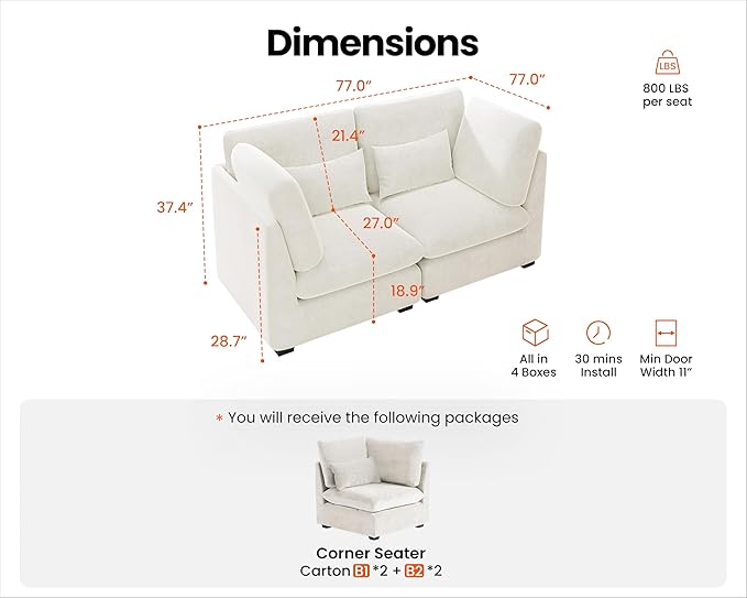 - 【Shipped in Four Packages for Easy Setup】To enhance your convenience, the sectional will be delivered in four packages, allowing for easier handling and assembly. Each package is carefully packed to ensure safety during transit, and while they may arrive at different days, rest assured that our professional customer service is ready to assist you with any concern. The thoughtful design makes the setup process simpler and more efficient,ensuring you enjoy your sectional without any hassle