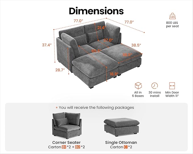 - 【Shipped in Six Packages for Easy Setup】To enhance your convenience, the sectional will be delivered in six packages, allowing for easier handling and assembly. Each package is carefully packed to ensure safety during transit, and while they may arrive at different days, rest assured that our professional customer service is ready to assist you with any concern. The thoughtful design makes the setup process simpler and more efficient,ensuring you enjoy your sectional without any hassle