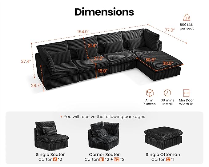 - 【Shipped in Seven Packages for Easy Setup】To enhance your convenience, the sectional will be delivered in seven packages, allowing for easier handling and assembly. Each package is carefully packed to ensure safety during transit, and while they may arrive at different days, rest assured that our professional customer service is ready to assist you with any concern. The thoughtful design makes the setup process simpler and more efficient,ensuring you enjoy your sectional without any hassle