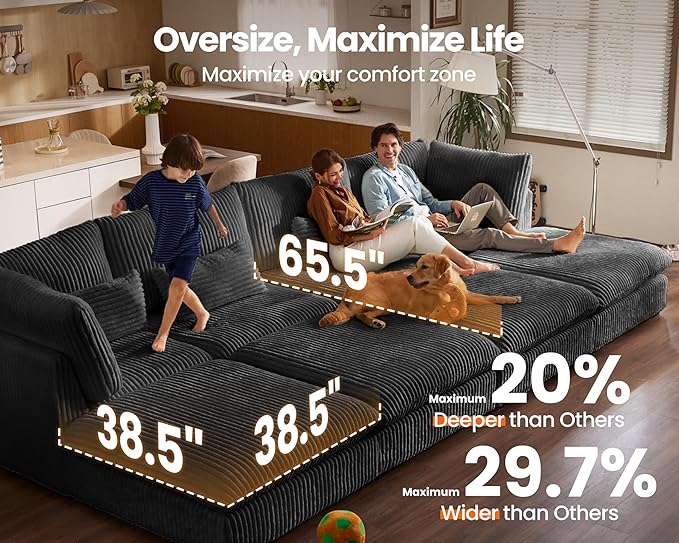 - 【Oversized Extra-Wide Deep Seating with Cloud-Like Comfy】Sink into expansive comfort with 27" deep seat—16.75~ 20% deeper than most sofas—and 38.5" wide seat—10~29.7% wider than typical couches. Stretch out freely with plenty of room to unwind. Featuring high-density foam, soft, skin-friendly corduroy and tightly woven chenille fabric. Relish in the perfect balance of plush softness and firm support. Whether focusing or relaxing, this sofa turns every moment into pure comfort