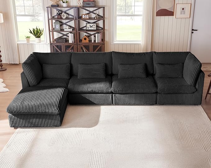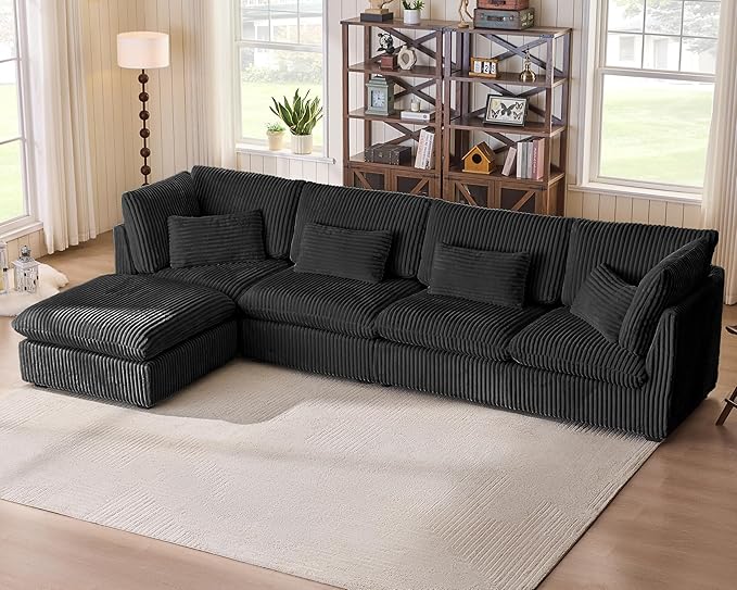 Oversized Modular Sofa, Extra Deep Cloud Corduroy Sectional Couch with Ottoman Chaise, Fluffy Corduroy 5 Seater Sofa Bed for Living Room, Villa (L Shape 5 Seater, Corduroy Black)