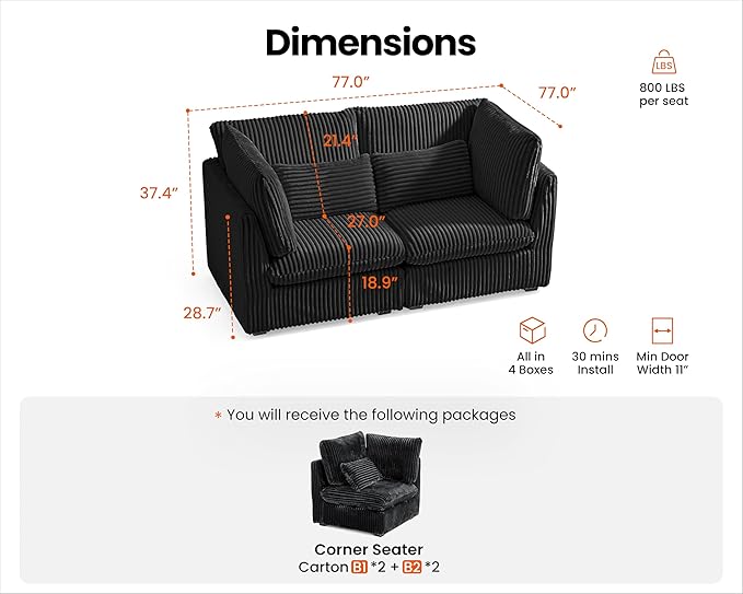 - 【Shipped in Four Packages for Easy Setup】To enhance your convenience, the sectional will be delivered in four packages, allowing for easier handling and assembly. Each package is carefully packed to ensure safety during transit, and while they may arrive at different days, rest assured that our professional customer service is ready to assist you with any concern. The thoughtful design makes the setup process simpler and more efficient,ensuring you enjoy your sectional without any hassle