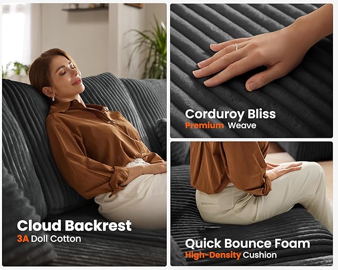 - 【Oversized Extra-Wide Deep Seating with Cloud-Like Comfy】Sink into expansive comfort with 27" deep seat—16.75~ 20% deeper than most sofas—and 38.5" wide seat—10~29.7% wider than typical couches. Stretch out freely with plenty of room to unwind. Featuring high-density foam, soft, skin-friendly corduroy and tightly woven chenille fabric. Relish in the perfect balance of plush softness and firm support. Whether focusing or relaxing, this sofa turns every moment into pure comfort