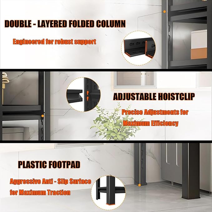 - [Versatile Design] lts unique snap - on design allows you to adjust the heightof the shelves according to your needs. Whether you have large - sizeddetergent bottles or small - sized laundry accessories, you can transform this5 - tier stand into a functional storage unit, it's not only practical but alsoadds an elegant touch to your laundry room, making it suitable for use inbasements, utility rooms, or even in the corner of your bathroom