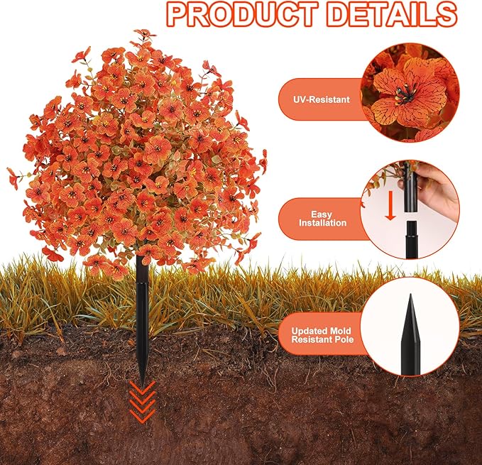 - 🍂【High-quality Materials】 The 4 packs fake fall flowers for outside are made of high-quality poisonless and harmless PC plastic and silk fabric. You can put this autumn artificial plants & flowers outdoors without any worries about withering and fading because they are double UV-resistant.