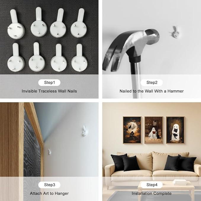 - 【Halloween Cute Ghost Wall Art】This set of three framed paintings features a charming and whimsical take on Halloween ghosts. With ghosts and black cats as the theme, perfect for decorating during the Halloween season or for adding a touch of mysterious charm to your home year - round. It can be a great conversation starter and a unique addition to your holiday decor collection.