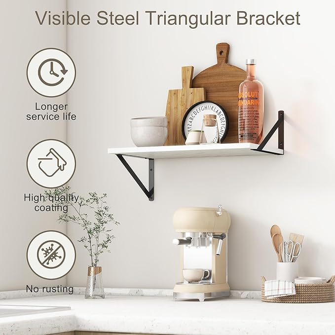 - 【FARMHOUSE RUSTIC WALL SHELF】These floating shelves are made of premium engineered wood board and visible triangular bracket. The rustic wooden grain surface add character and warmth to any modern or traditional interior with these deep floating shelves, contrast shelves at staggering heights on the wall or mount side-by-side or in the corner for a clean streamlined look.