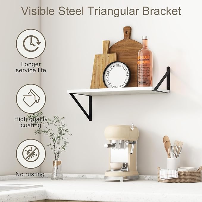 - 【FARMHOUSE RUSTIC WALL SHELF】These floating shelves are made of premium engineered wood board and visible triangular bracket. The rustic wooden grain surface add character and warmth to any modern or traditional interior with these deep floating shelves, contrast shelves at staggering heights on the wall or mount side-by-side or in the corner for a clean streamlined look.