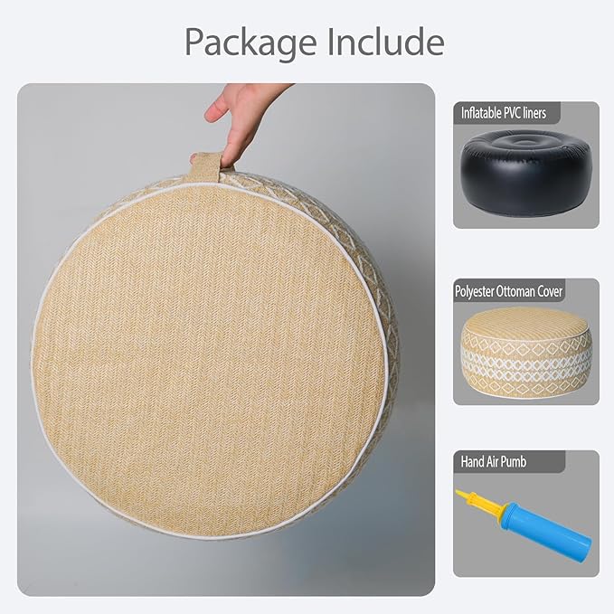 - The package contains 1 pcs outdoor/indoor inflatable ottoman measures D21” x H9”. 1 pcs sturdy inflatable PVC liner. One easy-to-use inflating air pump is included.