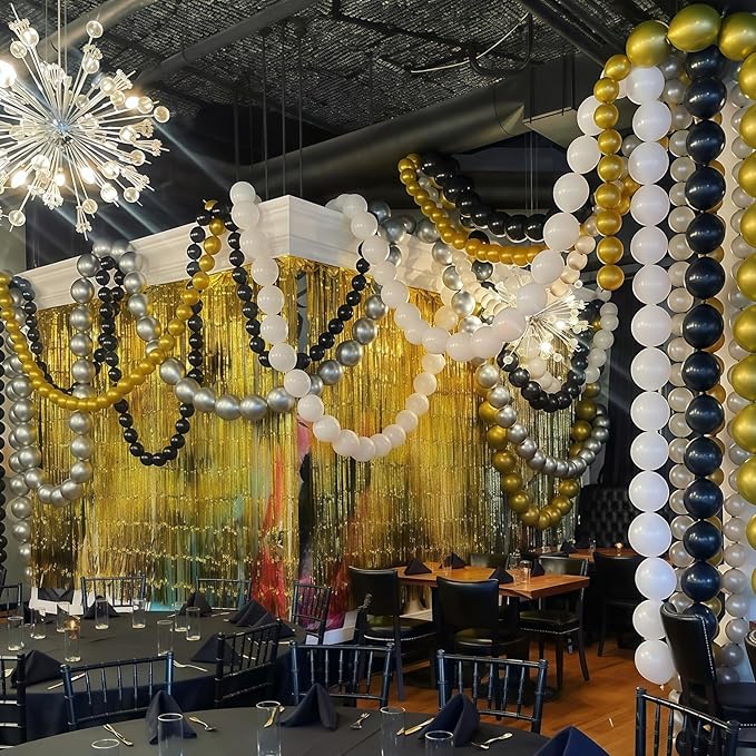 - High Quality Chain Balloons - Our chrome silver and black latex balloons are made of high quality materials with excellent elasticity and toughness. Linkable balloons are not easy to break or leak, and can stay full for a long time. The linking balloons will not fall off or damage easily during use, providing reliable quality assurance for your decoration needs.