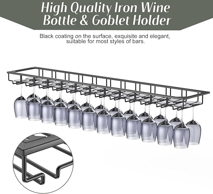 - [Durable and Rustproof] - This glasses hanger rack is made of high-quality iron with black coating,sturdy enough,increasing durability of this rack and prevent the rack from oxidizing and rusting.There is no worry about affecting beauty of your kitchen or bar .This rack is beautiful,useful,easy to clean and service for a long life time.