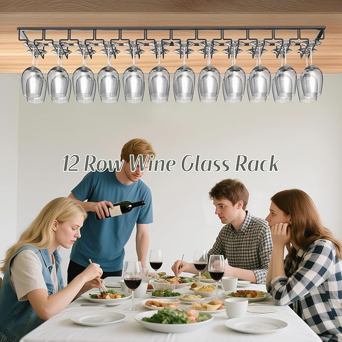 Xverycan Wine Glass Rack Under Cabinet, 12 Row Extreme Large Stemware Hanger, Metal Wine Goblet Holder, DIY Bar Glass Storage Rack for Bar Counter, Kitchen, Screws Included