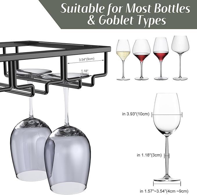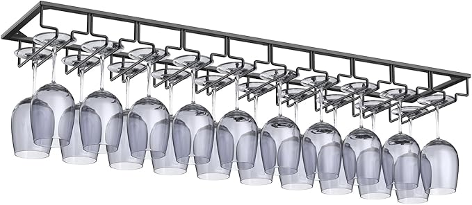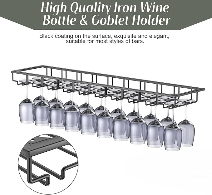 - [Durable and Rustproof] - This glasses hanger rack is made of high-quality iron with black coating,sturdy enough,increasing durability of this rack and prevent the rack from oxidizing and rusting.There is no worry about affecting beauty of your kitchen or bar .This rack is beautiful,useful,easy to clean and service for a long life time.