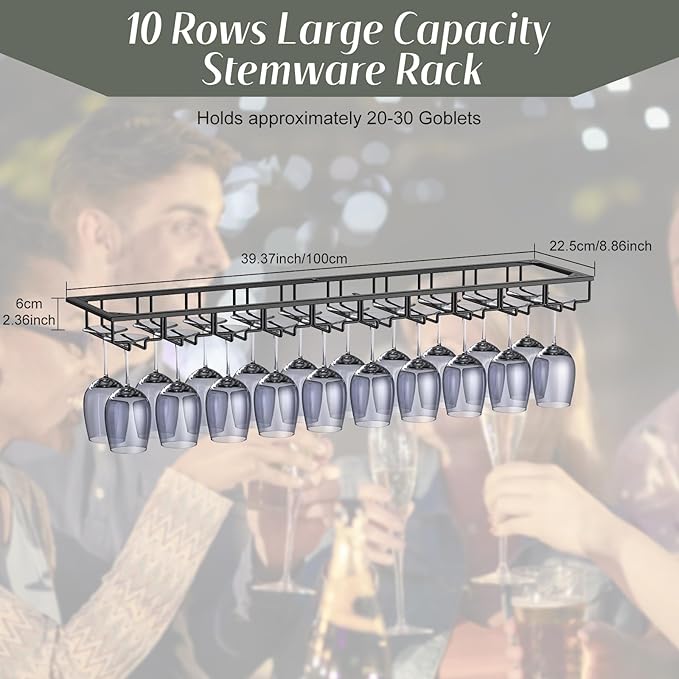 - [10 Rows Wine Glasses Holder] - The size of this wine glass metal rack is 39.37inch/100cm long; 22.5cm/8.86inch wide; 6cm/2.36inch high and totally 10 rows for hanging wine glasses.This hanging rack can store about 20-30 stemware depending on different glasses sizes.This wine glass rack is suitable for the glasses size like :glass base diameter:1.57-3.54inch/4-9cm;main body diameter:less than 3.93inch/10cm; glass stem diameter:less than 0.98inc/2.5cm.