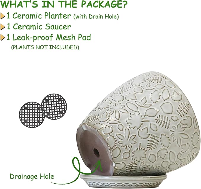 - Size & Package: 10 Inch Pot . Package: contains 1 ceramic flower pots, 1pcs mesh pads and 1pcs saucers(NOT INCLUDE PLANTS)