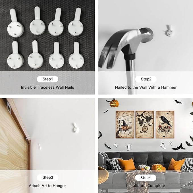 - 【Vintage Halloween Wall Art】Enhance the Halloween atmosphere of your home with HLNIUC Halloween Pumpkin Skeleton Decoration Paintings, our frame paintings combine rich Halloween elements such as pumpkin, ghosts, bats, skeletons, crows and roses, full of artistic sense to meet different decorative styles and personal preferences. Create a mysterious and horrifying Halloween holiday atmosphere for your home decor.