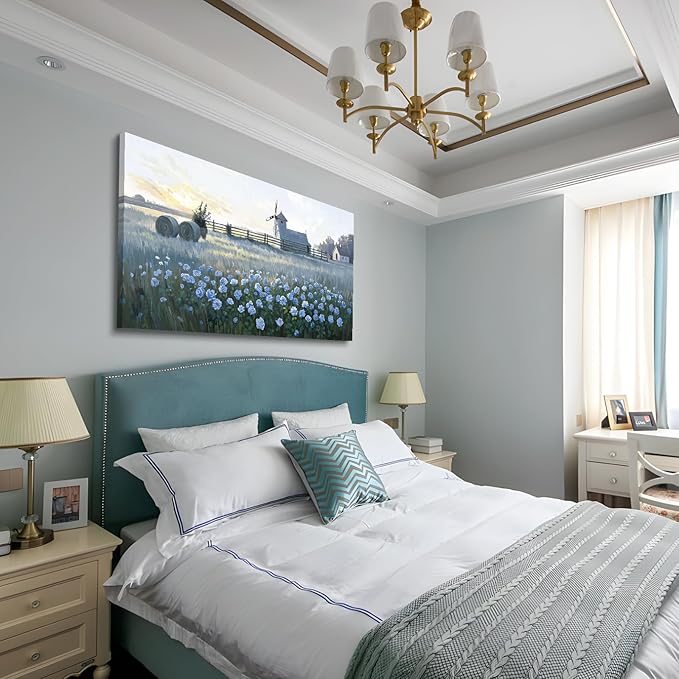 - Countryside Serenity in Bloom: Immerse your space in the tranquil beauty of a countryside sunset with this captivating blue rose and windmill canvas wall art. A delicate field of blooming blue flowers stretches beneath a golden sky, while a distant windmill and rustic farmhouse lend timeless country charm. This artwork captures pastoral romance and floral elegance—inviting warmth and calm into any room.