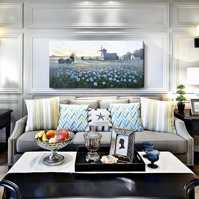 amatop Large Rustic Canvas Wall Art – Farmhouse Blue Rose and Windmill Landscape Picture, Nature Country Floral Sunset Wall Decor for Living Room Bedroom, Countryside Botanical Artwork Print 48x24 Inch