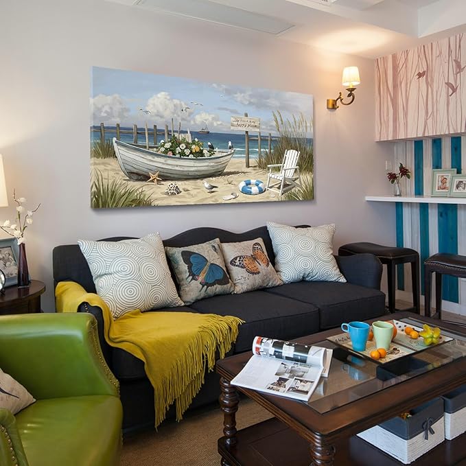 - Coastal Serenity for Your Space: Bring the tranquil beauty of the seaside into your home with this 48x24 inch beach wall art. Featuring a peaceful boat resting on the sandy shore, surrounded by gentle ocean waves, blooming flowers, delicate seashells, and soaring seabirds, it adds a soothing, coastal charm to any room — from living room to bedroom, hallway to beach house.