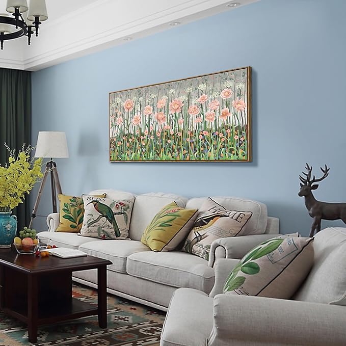 amatop Framed Large Floral Wall Art Modern Botanical Canvas Print Flower Field Wall Decor Abstract Landscape Picture Blooming Flower Forest Pink Green Artwork for Living Room Bedroom Office 48x24 in