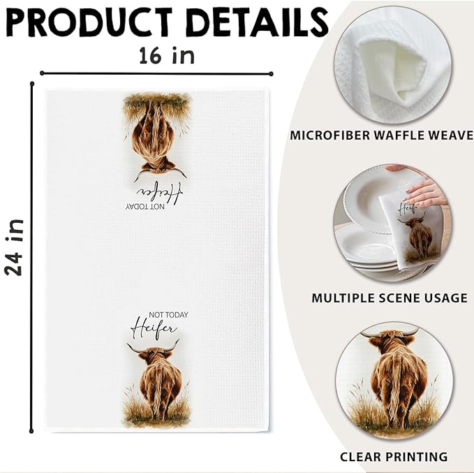 Not Today Heifer Highland Cow Hand Towels for Farmhouse Kitchen Bathroom Decor | Funny Waffle Weave Microfiber Dish Towel Western Gift