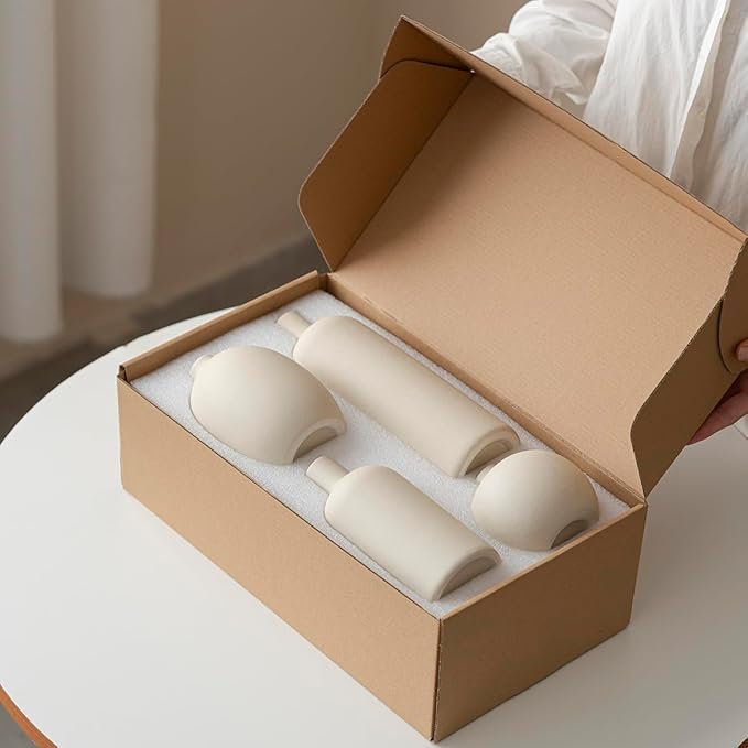 - VERSATILE SET: Collection includes 4 uniquely shaped ceramic vases in complementary neutral tones - Terracotta, Cacao brown, and peachy hues for a cohesive look