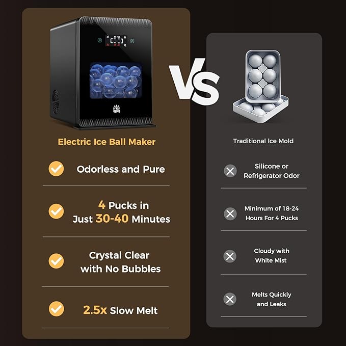 - 【30-Minute Whiskey Ice Ball Ready】No more long waits. Produce four slow-melting, crystal-clear ice balls in just 30 minutes. This rapid-freeze technology is perfect for whiskey nights, letting you impress guests with bar-quality ice.