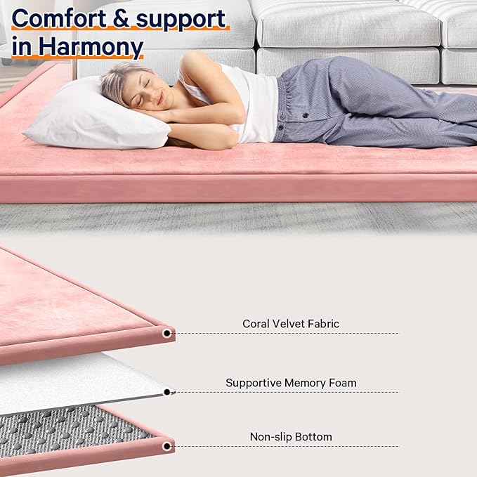 - π£SAFE & COMFY: Our baby play mat is made of 100% coral velvet material and filled with high-quality 3.5cm thick memory foam,eco-friendly and durable, providing a safe and comfortable play area for your babies, without worrying about them hurting themselves on hard floors.The surface of this tummy time mat is velvet cover, which is not only soft and comfortable to touch, but also has a good cushioning effect.