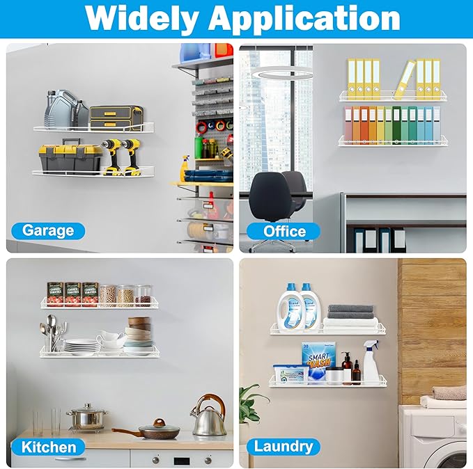 - Widely Application: The modern and simple design of metal floating shelves can be integrated into a variety of decoration styles, can be used in the garage, kitchen, living room, study, bathroom, laundry room, office, is an ideal choice for efficient storage.