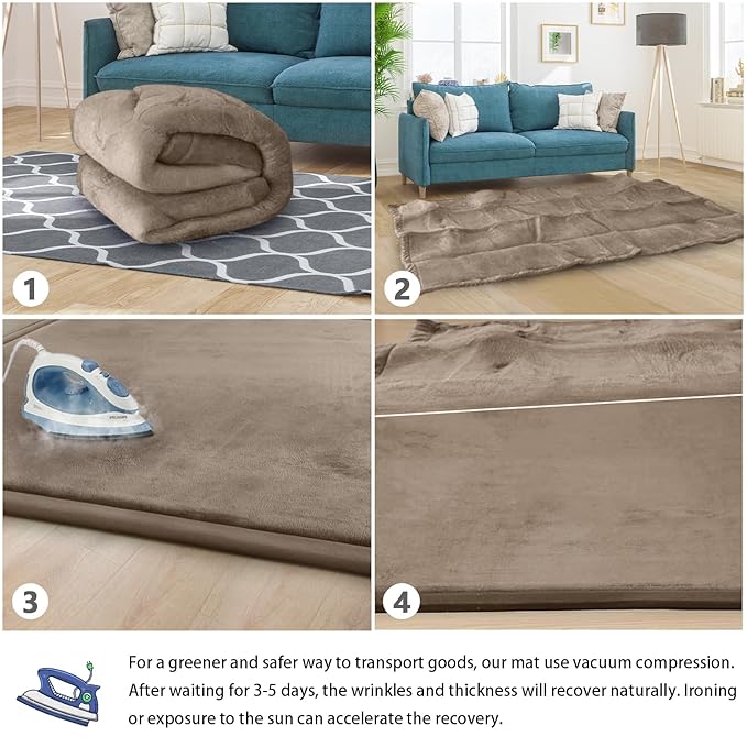 - πHOW TO CARE FOR YOUR MAT:When you open the package,it may be wrinkled,very flat and inelastic.Don't fret - this is normal! As long as it is left for 3-5 days, the mat will naturally regain its thickness and elasticity. we recommend steaming or ironing it to speed up recovery. After you have completed the steaming/ironing, your thick floor padded mat should rebound and be ready to use!