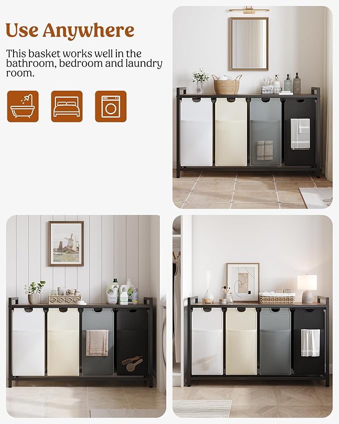 - Pull-out & Removable Design: 4 collapsible laundry sections is designed for easy pull-out of the clothes hamper, then you can remove the laundry bags to the laundry room. Feature a bottom board to offer extra support -No Sag When Laundry Bags Full.